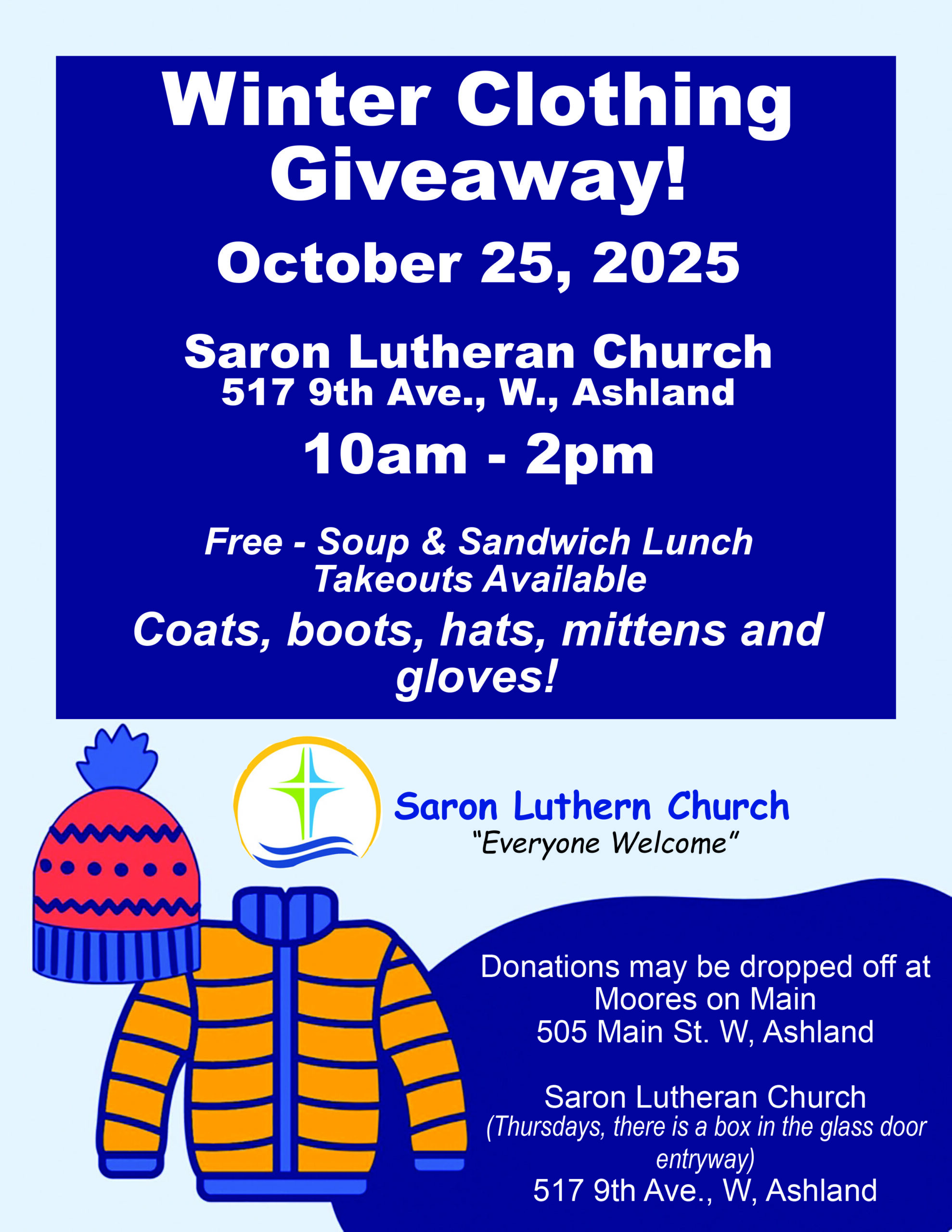 Clothing/boots donations may be dropped off at Moores on Main (505 Main Street W, Ashland) or at Saron Lutheran (Thursdays only, 517 9th Avenue W, Ashland).